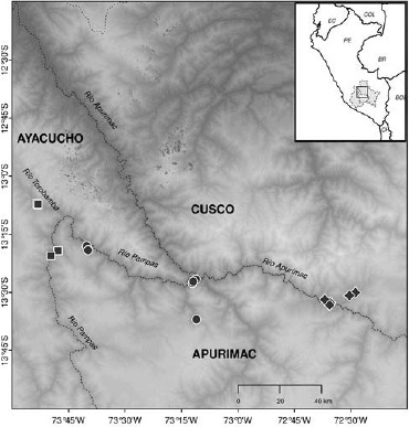 Nuestro conocimiento florístico del sistema de BSI del Apurímac está principalmente basado en estudios realizados en el mismo valle del Apurímac. Sin embargo, los BSI en esta región se extienden a todos los tributarios de este río, entre los 1 000 y 2 900 msnm (Linares-Palomino, 2013). Ante este escenario de información escasa para un ecosistema con altos niveles de fragmentación y amenazado globalmente (DRYFLOR et al., 2016), nuestro estudio evaluó la situación actual, en términos de diversidad, composición y estructura vegetal de los BSI de valles alejados del río Apurímac (ríos Torobamba y Pampas). En base a estos datos analizamos las relaciones florísticas de estos valles con otros parches de bosques secos en el sistema de valles del Apurímac para identificar subgrupos vegetacionales que tendrían su origen en el patrón ecológico y biogeográfico denominado decaimiento de la similitud de comunidades con la distancia geográfica (Nekola & White, 1999; Morlon et al., 2008). Este patrón biogeográfico aplicado a nuestra área de estudio nos sugiere que el valle del Apurímac conformaría el centro de diversidad del sistema de BSI del Apurímac, y que parches de BSI alejados y a mayor altitud de este núcleo central serían más paupérrimos en términos de diversidad. Los objetivos de este trabajo fueron 1) describir la vegetación de parches de bosques seco interandino poco conocidos, 2) evaluar si los bosques del sistema de valles secos del Apurímac constituyen una unidad homogénea o si existen subgrupos vegetacionales y finalmente 3) evaluar el estado de conservación de estos bosques para proponer acciones necesarias para su manejo.