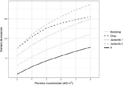 Los estimadores de riqueza no-paramétricos muestran valores contrastantes en el número potencial de especies. Según el estimado más conservador (Bootstrap), 14 especies no han sido detectadas; mientras que según la estimación más extrema (Jackknife 2), se indican 52 especies de plantas vasculares por descubrir en estos bosques (Figura 2).