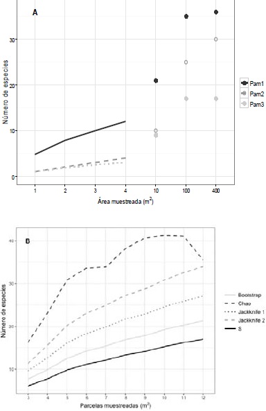 Las curvas de acumulación de especies obtenidas a partir de las tres parcelas evaluadas en el valle del río Pampas muestran que en las parcelas de 400 m. el número máximo de especies registradas fue de 36, muy cercano a las 35 especies registradas en parcelas de 100 m.. En parcelas de 10 m. el número máximo de especies registrado fue de 21 especies (Figura 3A). Los estimadores no-paramétricos en base a las 12 subparcelas de 1 m. indicaron que la zona de estudio contendría entre 21 y 35 especies de hierbas, arbustos menores y cactáceas (Figura 3B). En el valle del Pampas las parcelas tuvieron diversidades Shannon entre 1.46 bits/individuo (árboles, Pam3) y 2.47 bits/individuo (hierbas, Pam1).