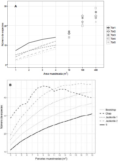Las curvas de acumulación de especies obtenidas a partir de las 5 parcelas evaluadas dentro del valle del río Torobamba muestran que en parcelas de 400 m. el número máximo de especies registrado fue de 29 especies. En las parcelas de 100 m. se registraron 25 especies y en las parcelas de 10 m. el número máximo de especies registrado fue de 17 especies (Figura 4A). Los estimadores no-paramétricos indican que en base a las 18 subparcelas de 1 m. la zona de estudio albergaría entre 37 y 47 especies de hierbas, arbustos menores y cactáceas (Figura 4B). Las parcelas en el Torobamba tuvieron diversades Shannon entre 1.69 bits/ individuo (árboles, Tor5) y 2.56 bits/individuo (hierbas, Tor1).