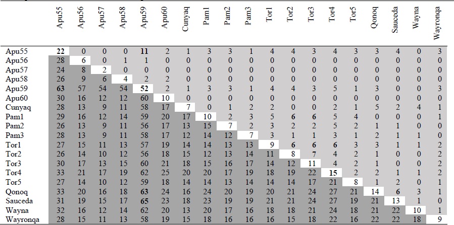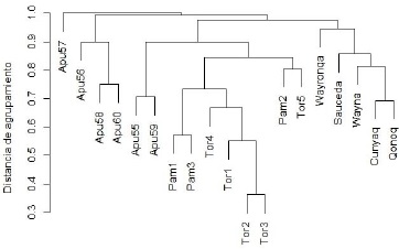 Al analizar las relaciones florísticas de las parcelas de los BSI del valle del río Torobamba y el río Pampas con otras parcelas evaluadas en el sistema de BSI del Apurímac, observamos que las parcelas con la riqueza de especies más alta se encuentran en el Apurímac (Tabla 2). Los demás inventarios tuvieron riquezas entre 4 y 15 especies. El número de especies compartidas entre pares de sitios fue bajo, y sólo un par compartió 11 especies, algunos otros pares compartieron entre 5 y 7, pero la mayoría entre 1 y 3 especies (Tabla 2). Estas características se reflejan en el dendrograma basado en la disimilaridad entre todos los inventarios del BSI del Apurímac disponibles. Se observaron tres grupos principales de parcelas ubicadas (i) en el valle del Apurímac (altura del cruce del puente Cunyac), (ii) en la confluencia del Pampas con el Apurímac y (iii) en la sección intermedia del Pampas y el valle de su afluente Torobamba (Figura 5). El bajo número de especies compartidas entre grupos se refleja también en los altos valores de disimilaridad que varían entre el 80% y 90% (Figura 5).