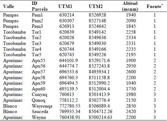 La expedición se realizó hacia el final de la temporada seca, entre el 29 de octubre y el 3 de noviembre del 2014 y evaluamos ocho puntos de monitoreo entre los 1800 y 2400 msnm. Tres en el valle del río Pampas y cinco en el valle del río Torobamba (Tabla 1 y Figura 1). El valle del río Pampas a la altura de Río Blanco (2093 msnm, Chincheros, Apurímac) tiene una precipitación de 611 mm anuales, concentrando 407 mm (https://en.climate-data.org/location/876262/) entre diciembre y marzo. El valle del río Torobamba a la altura de San Miguel (2612 msnm, La Mar, Ayacucho) tiene una precipitación de 536 mm anuales, concentrando 352 mm (https://en.climate-data.org/location/876274/) entre diciembre y marzo.