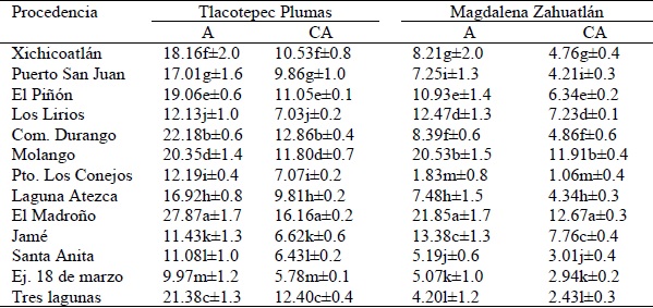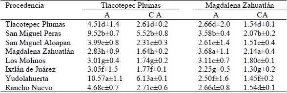 Se encontró diferencia estadísticamente significativa (p<0.05) entre el carbono acumulado en los suelos asociados a P. greggii en las dos comunidades, como se puede observar en la Tabla 1, también se puede apreciar que la cantidad de C acumulado en los suelos fue mayor en Tlacotepec Plumas que en Magdalena Zahuatlán. También se encontró que la procedencia El Madroño fue la que acumuló mayor cantidad de acículas y de C en ambas comunidades, que fue de 27.87 Mg C ha-1 y 16.16 Mg C ha-1, respectivamente para Tlacotepec Plumas y de 21.85 Mg C ha-1 y 12.67 Mg C ha-1, respectivamente para Magdalena Zahuatlán.
