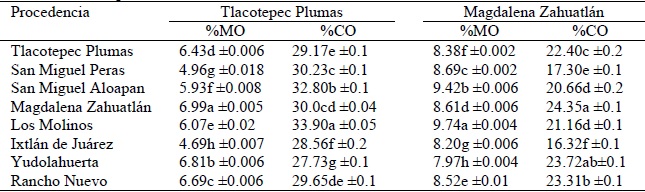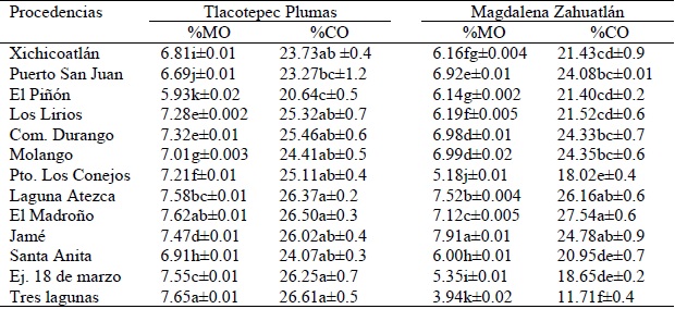Para la especie Pinus greggii (Tabla 3) la procedencia El Madroño tanto en Tlacotepec Plumas como en Magdalena Zahuatlán presentó alto contenido de MO (7.62% y 7.12%, respectivamente). En el contenido de Carbono orgánico, en la comparación entre comunidades, se encontró diferencia estadísticamente significativa (p<0.05) en ambas comunidades, que como se puede apreciar en la Tabla 3, fue mayor en Tlacotepec Plumas que en Magdalena Zahuatlán.