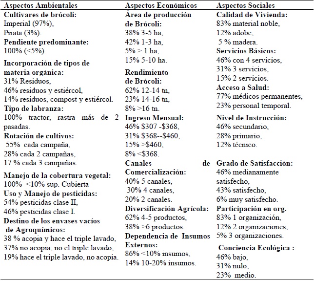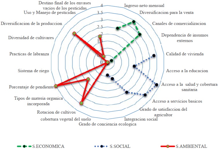 En el aspecto Social: Hay dos aspectos críticos (Figura 1). Uno es el grado de conciencia ecológica, porque la mayoría de los encuestados no percibe las consecuencias que pueden ocasionar algunas prácticas de manejo. Otro es el grado de integración social. En este sentido, tienen poca participación en organizaciones, además, no existe asociación de productores hortícolas.