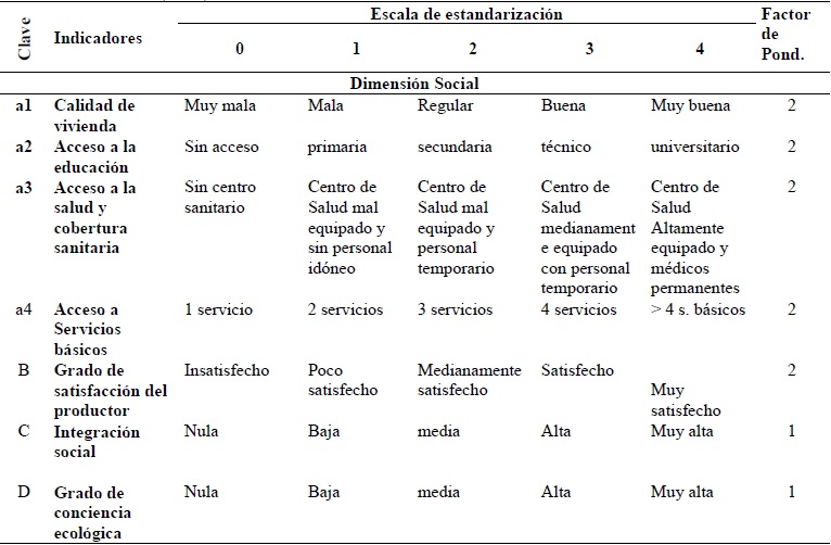 Selección de indicadores y cuantificación: Con el fin de identificar los puntos críticos que afectan a la sustentabilidad, fue efectuada la selección de indicadores mediante el criterio bottom up (de abajo a arriba), producto de una caracterización previa de los sistemas en estudio (Galván-Miyoshi et al., 2008) y el modelo de indicadores PER (Presión, Estado y Respuesta), que es explicado por efectos de causalidad, aplicado por Sarandón & Flores (2009). Bajo este contexto, los indicadores de presión se expresan en la diversificación de los sistemas de cultivo, rendimiento, consumo y comercialización; los indicadores de respuesta están relacionados con agroforestería (uso de especies arbustivas y arbóreas en la parcela), manejo integrado de plagas y restitución de nutrientes con abonos orgánicos; y los indicadores de estado se corresponden con el área destinado a la producción de brócoli, disponibilidad de mano de obra y satisfacción de servicios básicos. Estos indicadores fueron agrupados de acuerdo a su naturaleza o comportamiento ambiental, económico y social, como se indica en la Tabla 1. Los indicadores, según Belcher et al. (2004), son importantes porque permiten medir la sustentabilidad de un sistema complejo. Estos fueron estandarizados en una escala numérica (0 a 4) donde, el valor más bajo (0) representa una situación crítica para la sustentabilidad y el valor más alto (4) una mayor sustentabilidad, según el grado de afectación o contribución a la sustentabilidad (Tabla 1). Metodológicamente, la estandarización facilita la comparación entre las unidades de producción; así como el análisis de las dimensiones ambiental, económica y social de la sustentabilidad (Sarandón et al., 2006). La ponderación consistió en multiplicar el valor estandarizado por un factor, solo para aquellos indicadores que contribuyen significativamente al fortalecimiento de la sustentabilidad económica; y como tales adquieren un valor diferenciado (Tabla 1). La selección de indicadores a ponderar está relacionada con incremento en el rendimiento, mejora del suelo por aporte de nutrientes, estrategia para reducir pérdidas de cultivos por situaciones ambientales adversas, reducción del riesgo económico, entre otros.
