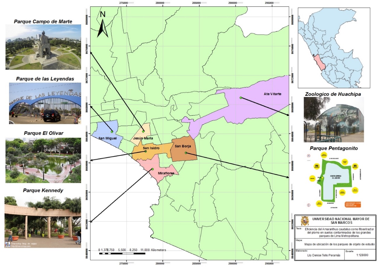 Los grandes parques de Lima Metropolitana (GPLM) son frecuentados por personas de diversas edades y para múltiples fines. El Campo de Marte, ubicado en el distrito de Jesús María, con 375.2 km2 de área, es muy conocido por realizarse desfiles militares y escolares, ferias artesanales y/o de alimentos típicos y posee ocho monumentos históricos. El Bosque El Olivar, ubicado en el distrito de San Isidro, con 230 km2 de área, fue declarado monumento nacional el 16 de diciembre del 1959, con 1 600 olivos dentro de un total de 1 946 árboles y con ejemplares de 350 años de antigüedad y 35 especies de aves estacionales más 22 nativas; por lo cual, en el año 2017 fue declarado Área de Conservación Ambiental. El parque El Pentagonito, ubicado en el distrito de San Borja, con un área aproximada de 5 km2, básicamente es un área verde que rodea el Cuartel General del Ejército del Perú y donde los vecinos trotan y realizan ejercicios. El parque Kennedy, ubicado en el distrito de Miraflores, con un área de 25 km2, es un parque donde constantemente se realizan cambios estructurales con movimientos y cambios de tierras debido a que su característica es ser lugar de actividades culturales y comerciales. Los suelos de Campo de Marte y Bosque El Olivar tienen cientos de años y el Pentagonito alrededor de 45 años. Estos parques colindan con vías de comunicación de acceso público y/o privado, incluso en el caso de Bosque El Olivar es atravesado por pistas automotrices con tráfico vehicular la mayor parte del tiempo (7.00 am a 9.00 pm) y hay casas de la época colonial. Se tiene como referencia que el uso de gasolina y pintura con plomo en su composición fue una fuente importante de este metal pesado en los suelos urbanos (Witzling et al., 2011), por lo que se prohibió su uso como aditivo. Esto se cumplió en el país a partir del 2005 (Arosquipa & Villegas, 2013; OSINERGMIN, 1998; OSINERGMIN, 2012).