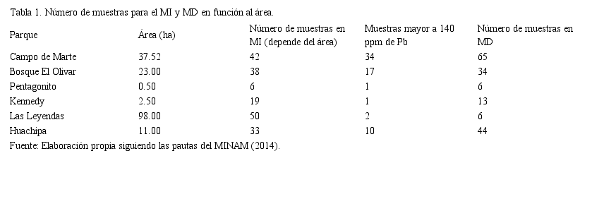 La investigación se realizó durante el 2016 en seis de los GPLM (Figura 1). Al no tener conocimiento previo de la distribución del contaminante plomo en el suelo, el número mínimo de puntos de muestreo estuvo en función del área de cada parque siendo éste el Muestreo de Identificación (MI) (Tabla 1).