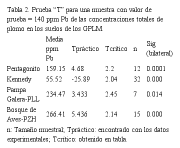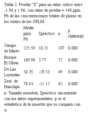 Se utilizaron dos pruebas estadísticas; la Prueba T para una muestra, para los parques con un número de muestreos menor a 40, donde si Tpráctico < Tcrítico no existen diferencias significativas y la Prueba Z para los parques cuyo número de muestreos fue mayor a 40 donde los valores de Z0.025 fueron -1.96 y 1.96 y se comparó p con α (0.05), donde si p < α existen diferencias significativas. El valor de prueba fue 140 ppm de plomo total que corresponde al límite máximo permisible por los ECA de suelos 2017.