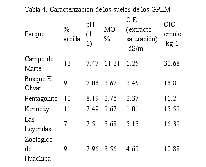 En cada parque se realizaron muestreos simples en profundidad de 0-10 cm de 20 g cada una formando una muestra compuesta. El patrón de muestreo fue rejillas regulares. Las seis muestras compuestas se secaron al aire y se pasaron por un tamiz de malla de 2 mm. Se determinaron: Textura con el método del hidrómetro y las lecturas de las partículas en suspensión se realizaron con el hidrómetro de Bouyoucos. Conductividad eléctrica (CE) en extracto de saturación, a 100 g de suelo se le añadieron 20 ml de agua desionizada, se removió y se agregó más agua a cada muestra hasta llegar a saturación. Finalmente con un sistema de vacío se realizó la extracción del líquido y la CE se midió con un conductímetro. También se midió directamente en el suelo luego de 30 minutos del riego. Ambas medidas se realizaron con el equipo Electrical Equipment for Measurement, Control, and Laboratory Use de Fieldscout Item 2265FS y solución estándar 2764 uS/cm. Capacidad de intercambio catiónico (CIC), mediante el extracto con acetato de amonio 1N pH 7 (Jackson, 1964). Para el pH se hizo una mezcla suelo-agua (relación 1:1) que se agitó y dejó en reposo por 10 minutos, la medición se realizó con el pH-metro Soil Stik de Fieldscout 2105. La materia orgánica fue determinada por el método de Walkley and Black (1934).