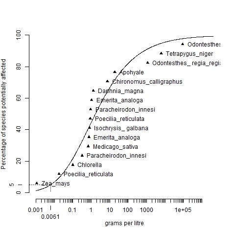 Para el caso del método SSD, también se emplea la misma CEE referencial aplicada anteriormente. Para este caso se usó un software gratuito Burrlioz 2.0 para calcular el CP5, el cual refiere el valor del 5to. percentil del total de especies acumuladas empleadas en el estudio con los valores de toxicidad siguiendo una distribución logística. Este cálculo pretende proteger el 95% de la biodiversidad de un ecosistema a partir de un umbral establecido de las pruebas ecotoxicológicas.