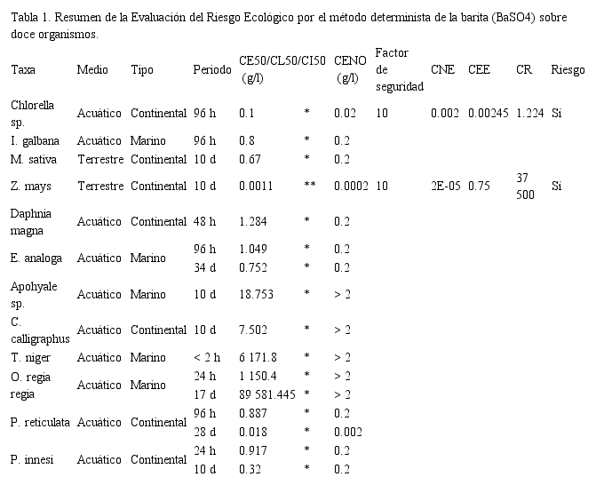 El objetivo de esta investigación fue calcular el riesgo ecológico de la barita, empleando la respuesta ecotoxicológica de doce organismos.