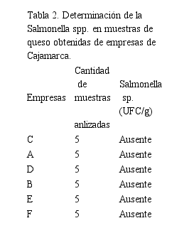 Se observa en la Tabla 2 que, el 100% de las empresas productoras de queso fresco industrial no se reporta presencia de Salmonella spp.