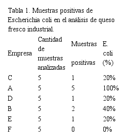 La Tabla 1 presenta el total de muestras analizadas, y el número de muestras que dieron un resultado positivo, además se estima el porcentaje de muestras positivas de E. coli para cada una de las empresas productoras de queso fresco industrial.