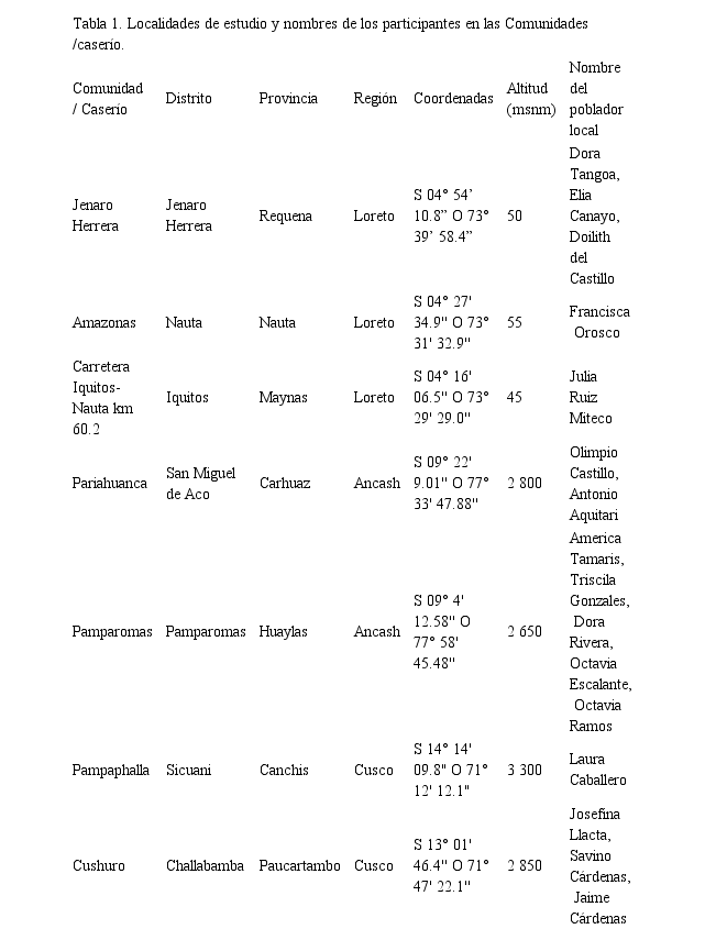 El área geográfica en la que se realizó el trabajo de recolección de información y recolección botánica comprende siete localidades ubicadas en las regiones de Loreto (comunidades amazónicas), Ancash y Cusco (comunidades andinas) (Tabla 1, Figura 1). El estudio se ejecutó entre los años 2014-2016.