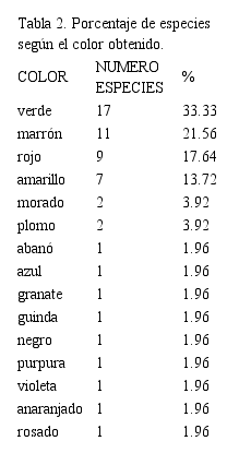 De la gama de colores obtenidos, de acuerdo con el modelo Red-Green-Blue Color Space (RGB), (Pascale, 2003), los colores primarios rojo, verde y azul se obtuvieron en un 52.93% de las especies registradas. Mientras que, en la gama de colores secundarios, el amarillo, se obtuvo en un 13.72%. Como color terciario, el marrón, se obtuvo en el 21.56% de las especies con las que se experimentó (Tabla 2). Finalmente, los colores obtenidos de las fibras fueron codificados atendiendo la tabla Munsell Color (Munsell, 1912), a fin de estandarizar especificaciones en torno al color obtenido y minimizar subjetividades.