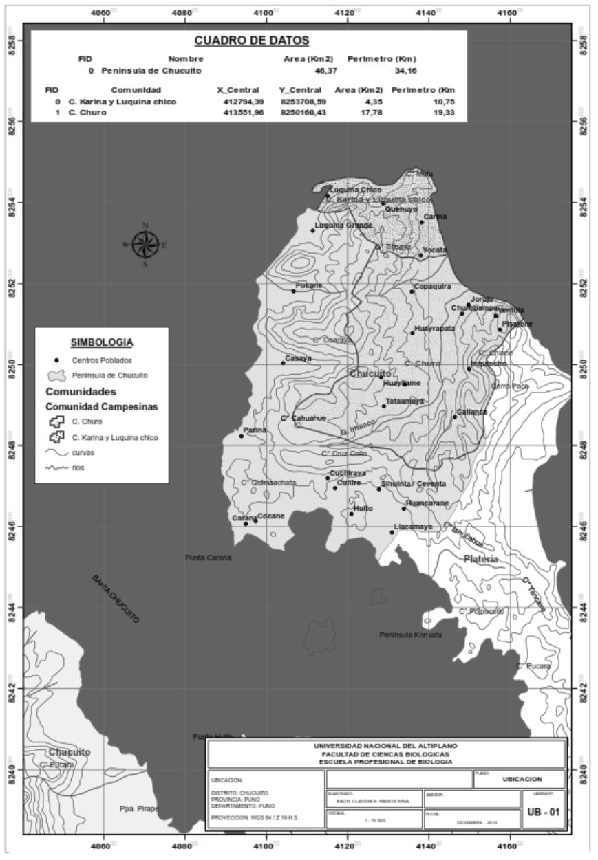 La investigación fue realizada en tres comunidades cuyas condiciones termodinámicas, por su cercanía a las orillas del lago Titicaca, permitirían tener mayor posibilidad de producción agrícola, dentro de la península de Chucuito – Perú; las cuales son las localidades de: Churo, Karina y Luquina Chico, ubicadas entre las coordenadas: 15°50’16”S, 69°48’20”O. Las comunidades humanas de la península de Chucuito son eminentemente agropecuarias, tienen extensiones de terreno cultivado de alfalfa (Medicago sativa) que en promedio es de 1 ha/familia. El área de estudio total en la península que comprende las tres comunidades (Churo, Luquina y Karina), es estima en 22.13 km². Este cálculo se realizó en base a la georreferenciación de las zonas estudiadas (Figura 1).