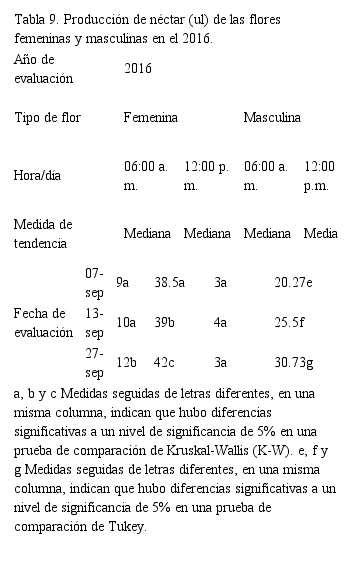 La producción de néctar en unidades volumétricas fue evaluada en las flores femeninas y masculinas el día de antesis, en los años 2015 y 2016. El muestreo se realizó en una flor femenina y en tres masculinas por planta, evaluando 10 plantas por día y en 3 días no consecutivos considerando la hora de apertura y cierre floral (6:00 a.m. y 12:00 p.m. aproximadamente) durante el periodo de floración. Con una micro pipeta se colectó todo el volumen del néctar contenido en los nectarios de la flor (Nepi et al., 1996).
