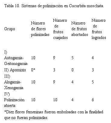 Agbagwa et al. (2007) reportaron para C. moschata un 70% de frutos formados; estos resultados son similares a los obtenidos en este trabajo; sin embargo, no mencionan si el 30% restante que no se formó, fue debido al aborto o a la falta de polinización.