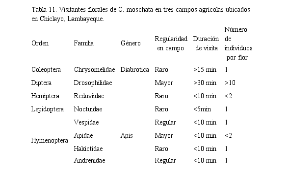De los resultados obtenidos y resumidos en la Tabla 11 se indica que el orden Hymenoptera tiene el mayor número de familias con afinidad por las flores del “Loche”. De ellas, las familias Vespidae y Apidae son las de mayor regularidad y las que han sido encontradas en los campos de este cultivo. Las recompensas florales influyen directamente en la conducta del polinizador y como consecuencia afecta el éxito reproductivo de las plantas, ya sea incrementando las visitas del polinizador como lo ocurrido con el orden Hymenoptera o aumentando la probabilidad de éxito de la polinización (Pang et al., 2012), permaneciendo un periodo de tiempo más largo dentro de la flor como en el caso del orden Diptera, cuyas visitas a las flores de C. moschata duraron hasta 30 minutos al igual que el orden Hymenoptera.