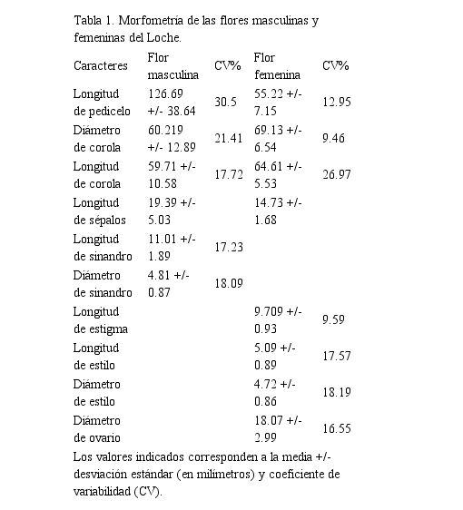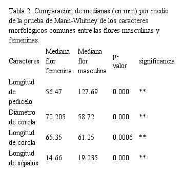 De las mediciones realizadas, todos los caracteres florales evaluados en ambos tipos de flores, son diferentes en longitud y diámetro tanto en las flores masculinas como en las femeninas, tal como se puede observar en la Tabla 2.