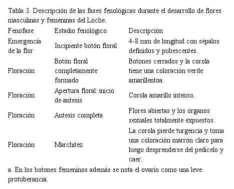 En el año 2015, en las tres repeticiones que se trabajaron con la finalidad de establecer las fenofases y estadios fenológicos, la aparición de los botones masculinos se dio entre la semana 10 y 11 del cultivo, y 2 semanas más tarde ocurrió la aparición de los botones femeninos.