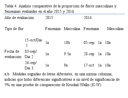 En el 2016 (Tabla 4); no existen diferencias estadísticas entre la cantidad de flores femeninas por rama en los tres días evaluados (p=0.922), siendo una flor la mediana en las tres muestras, al igual que en las flores masculinas donde no existen diferencias entre los días evaluados (p=0.934), siendo 10 flores masculinas la mediana en los tres días evaluados.