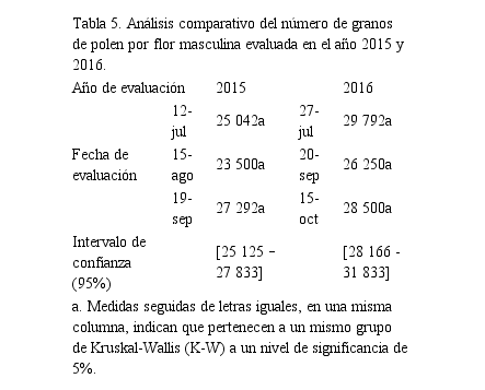 No se encontraron diferencias estadísticamente significativas entre el número de granos de polen producidos por flor en los tres días evaluados (p=0.394 y p=0.179 respectivamente) siendo el promedio para estos tres días evaluados en el 2015, de 27 051 +/- 8 956 granos de polen por flor y en el 2016, de 31 266 +/- 11 976 granos de polen por flor (Tabla 5).