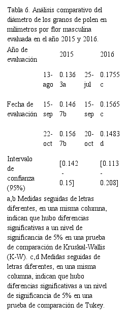 De los granos de polen medidos durante el 2016 (Tabla 6), se puede afirmar que existen diferencias significativas entre el diámetro de granos de polen por flor en los tres días evaluados (p=0.000). Luego se hicieron comparaciones múltiples de Tukey, las cuales mostraron como un grupo a los días 1 y 2, donde las medias fueron 0.1755 mm y 0.1565 mm y separaron como otro grupo al día 1 con una media de 0.1483 mm. Se halló un promedio con los dos días que formaban un mismo grupo de Tukey, así se tiene 0.160 +/- 0.032 mm como diámetro para las muestras evaluadas en el 2016.
