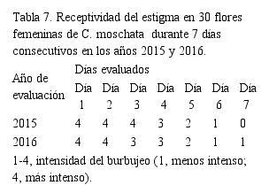 La receptividad del estigma es intensa hasta el tercer día después de la antesis, pero disminuye hasta ser casi nula al séptimo día.