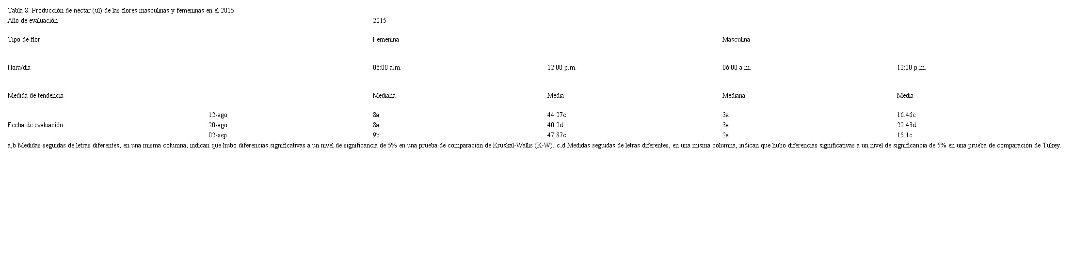 De la evaluación que se realizó en el año 2015 (Tabla 8), se realizaron comparaciones de K-W (p=0.006), resultando como grupos de K-W los días de evaluación 1 y 2, donde las medianas fueron 8 y 8 ul de néctar por flor y separó como otro grupo al día 3 con una mediana de 9 ul. Se halló un promedio con los dos días que formaban un mismo grupo de K-W, así se tiene 8 +/- 0.131 ul de néctar como volumen para las flores evaluadas en el 2015.