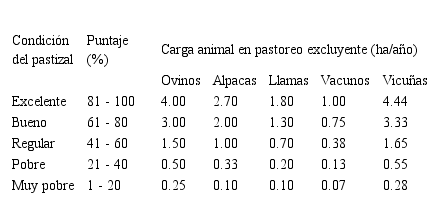 La condición del pastizal de las parcelas se evaluó al inicio y final del experimento con la metodología propuesta por Oscanoa & Flores (2016) a través de los índices de especies deseables (D en %), índice forrajero (IF = % de especies deseables más poco deseables), índice de suelo desnudo más pavimento de erosión más roca (BRP en %) y el índice de vigor (V en %) de las especies vegetales claves (Parker, 1951). La integración matemática de los índices parciales de condición se realizó con la Fórmula: