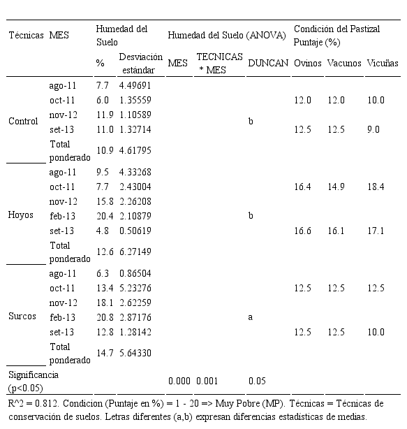 En dos años de estudio la condición del pastizal muy pobre para ovinos, vacunos y vicuñas no lograron mejora con ninguna de las técnicas aplicadas (“hoyos” y “surcos”); en cambio la humedad del suelo de “surcos” mostró superioridad significativa en los factores técnica, mes y su interacción (R2=0.812; p<0.05). Al comparar el factor mes (noviembre 2012 y febrero 2013) con los otros meses estudiados, estas mostraron diferencias estadísticas significativas en todas sus combinaciones (Tabla 2).
