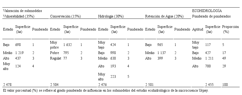 La ciencia ecohidrológica de montañas busca integrar los parámetros ecológicos e hidricos de los pastos naturales altoandinos con el propósito de mejorar las funciones ambientales dañados. En ese sentido dentro la tabla de valoracion del modelo ecohidrológico resaltan por nivel de importancia las temáticas de vulnerabilidad e hidrología del pastizal (Tabla 3). La primera expresa el mayor peso del efecto de vulnerabilidad para el ecosistema pastizal (35%) ocacionados por la acción directa del hombre y la segunda el grado (30%) de influencia del deterioro autoregulatorio de la caída de lluvias en la recarga natural del agua del rio Urpay (Figura 4).