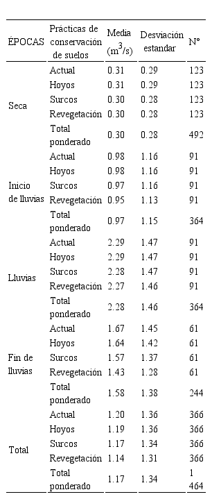 Los resultados demostraron que si es posible estimar la descarga de agua superficial dentro el complejo sistema del pastizal. Yan et al. (2013) observaron semejantes resultados al presente ensayo y señalaron que los principales cambios que afectaron el caudal son los cambios en las tierras de cultivo, bosques y áreas urbanas, y los cambios en los pastizales no ejercieron influencia significativa en el caudal y producción de sedimentos. En contraposición a estos resultados, Stehr et al. (2010) manifestaron que la sustitución de los pastizales con plantaciones de especies introducidas causó una reducción de la media anual de descarga en un 10%. Finalmente, Nearing et al. (2011) indicaron la necesidad imperiosa de contar con un modelo para predecir la erosión del suelo de pastoreo porque la que existen se desarrollaron para estudiar tierras de cultivo con características de procesos hidrológicos diferentes al pastizal debido a la heterogeneidad de las propiedades y uso del suelo.