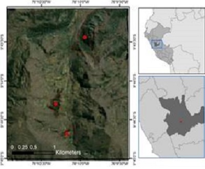 Unchog (3 800 m, 09°42'32.3" S, 076°09'39.1" W), where we did our surveys, is communal land of the Comunidad Campesina Cochabamba of Huánuco. There were three elfin forest patches with continuous vegetative cover (Unchog, Magma and Simeompampa), with ~8 ha each and no more than 2 km apart from each other (Figure 1). The predominant trees are several species of the Weinmannia genus, which is common in the Andes above 2 000 m (Rapp et al., 2012). Between these elfin forest patches, there were native shrubs and pastures.