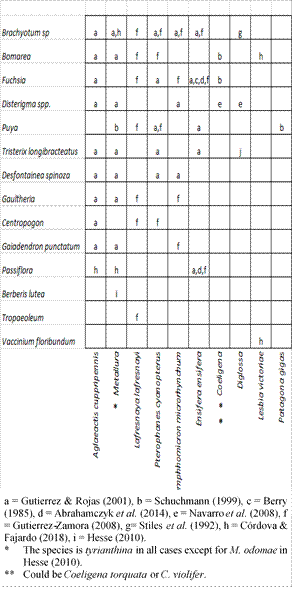 a = Gutierrez & Rojas (2001), b = Schuchmann (1999), c = Berry (1985), d = Abrahamczyk et al. (2014), e = Navarro et al. (2008), f = Gutierrez-Zamora (2008), g= Stiles et al. (1992), h = Córdova & Fajardo (2018), i = Hesse (2010). * The species is tyrianthina in all cases except for M. odomae in Hesse (2010). ** Could be Coeligena torquata or C. violifer.