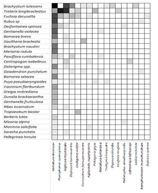 Hummingbirds of the genus Coeligena visits several species of plants in Andean forests, Schuchmann (1999) reported them visiting Bomarea, but we did not observe Coeligena feeding on Bomarea. The other plants reported by Schuchmann were not in our study area. Schuchmann (1999) also did not report Tristerix as food for Pterophanes cyanopterus as we observed. Gutiérrez & Rojas (2001) in the paramos of Colombia, found that there is a strong dependence of several small billed hummingbirds with Brachyotum. They also found dependence of Pterophanes with Puya; but not with Tristerix which was also present there. Metallura odomae, sister taxa of Metallura theresiae in high elevation montane forest in the north of Peru feeds mainly in Brachyotum and in Berberis (Hesse, 2010). Small-billed hummingbirds rely on Brachyotum, its importance in the network is explained in Gonzalez & Loiselle (2016). Schuchmann (1999) mentions that the Shining Sunbeam Aglaeactis cupripennis does local migrations, Heliangelus prefers shrubs in the ecotone between paramo and forest and Coeligena forages in the forest itself or forest edges.