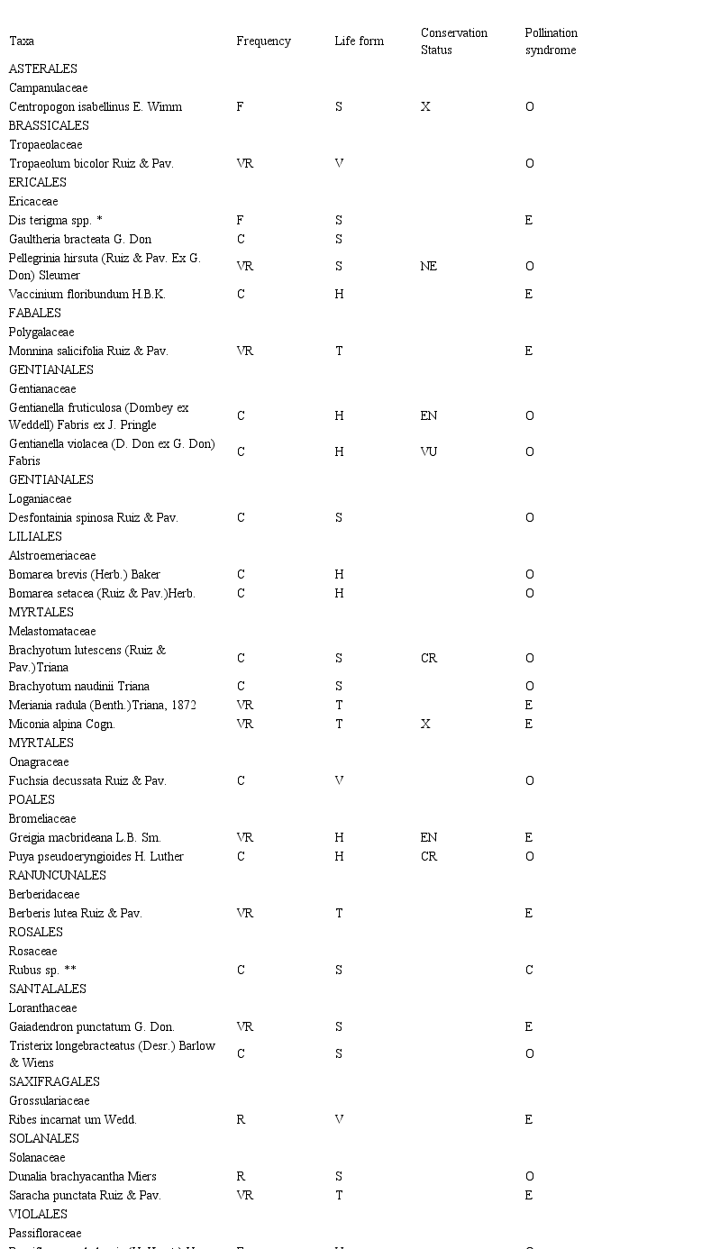 Frequency in flowers /ha. Very rare (VR) = Less than 40, Rare (R) = Between 40-100, Frequent (F) = Between 101 – 1 000, Common (C) = More than 1 000. Life form: T = tree, V = vine, S = Shrub, H = Herb. Conservation status is based in Leon et al. (2006): CR = Critical; EN = Endangered; VU = Vulnerable; NE = Not evaluated; X = endemic without categorization. Pollination syndrome: O = Ornithophilus, E = Entomophilus, C = Chiropterophilus.