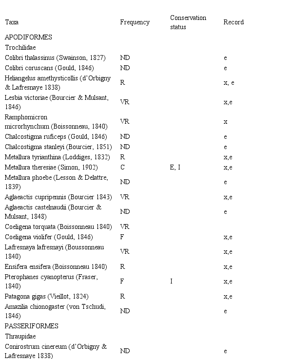 The frequency criteria is based on data of individuals captured in 100 net-hours: No data (ND), Very rare (VR) = Less than 2, Rare (R) = Between 3 to 5, Frequent (F) = Between 6 to 11, Common (C) = more than 12. Conservation status: E = Endemic for Peru, I= Elfin forest indicators (Parker et al.,1996). Record: x = This study, e = eBird.