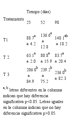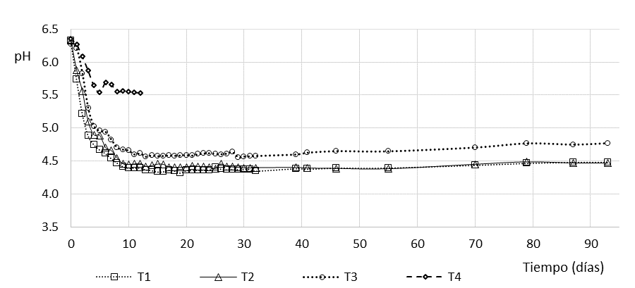 El T3 mantuvo valores de pH cercanos a 4.6, pero no llegó a 4.5 (Figura 2). Su formulación contenía menor cantidad de melaza, equivalente al 7% de los residuos, en comparación con los demás tratamientos (15% de los residuos), es probable que haya sido insuficiente la cantidad de melaza para que A. oryzae pueda generar mayor cantidad de ácido. Vásquez et al. (2011) elaboraron un ensilado biológico con elevado porcentaje de glucosa, a nivel de laboratorio, a partir de residuos viscerales (estómago e intestinos) de pez espada, raya y tiburón, a 25 °C con 25 g de residuos triturados, 8 ml de glucosa (equivalente a 32% de los residuos) y 2 ml del inóculo de bacterias lácticas, logrando ensilados con valores de pH< 4.5.