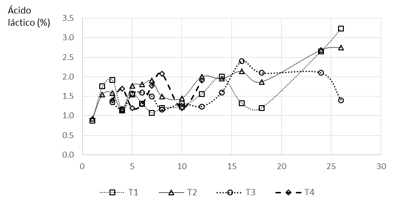 Los valores de acidez de los tratamientos de ensilado fueron fluctuantes (Figura 3), el valor de la acidez no es un buen indicador para evaluar el proceso de ensilado, al tener un comportamiento errático.
