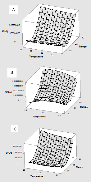 El análisis estadístico del conteo de UFC/g (Tabla 4) indica que el tiempo de incubación tiene un efecto significativo positivo en su crecimiento. La temperatura no tiene un efecto significativo en el conteo de las UFC/g (Figuras 1 y 2), no obstante, los valores de temperatura y tiempo fueron cercanos al rango de temperatura de 28 - 32 °C y el tiempo de 46 - 58 h mencionado por Bechman et al. (2012) en los cuales A. oryzae tiene el mayor crecimiento y actividad α-amilasa. Esta actividad enzimática permite en el proceso de ensilado la formación de ácidos y la disminución del pH.