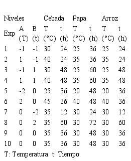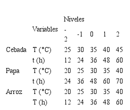Las condiciones óptimas de incubación para los diferentes sustratos fueron determinadas con la metodología de superficie de respuesta (MSR) con diseño compuesto central rotable. Se utilizó el programa estadístico Minitab; el diseño consideró 5 niveles para cada factor (Tabla 1), para la cebada, papa y arroz, los niveles están con códigos: -2, -1, 0, 1 y 2. El programa Minitab diseñó 10 experimentos según los niveles con una repetición en el nivel central (Tabla 2). El nivel superior de la temperatura de incubación (45 °C) de la papa se disminuyó, debido a que en los minutos de incubación el sustrato se licuefactó, considerándose valores diferentes que los niveles de cebada.