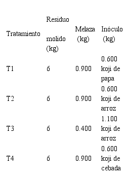 Se trituraron los residuos con una moledora de carne Ferton- MLCO32 con capacidad de 320 kg/h y con la melaza fueron colocados en baldes de 10 litros, se mezclaron y luego se agregó el koji según las cantidades establecidas en el Tabla 3.