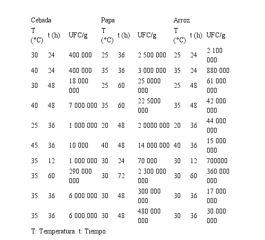 Transcurrido el tiempo de incubación, se determinó el conteo de hongos y los resultados fueron ingresados en el programa Meet Minitab versión 15 (Minitab) (Minitab, 2007). También se determinó la temperatura y tiempo óptimos de crecimiento de A. oryzae en arroz, papa y cebada.