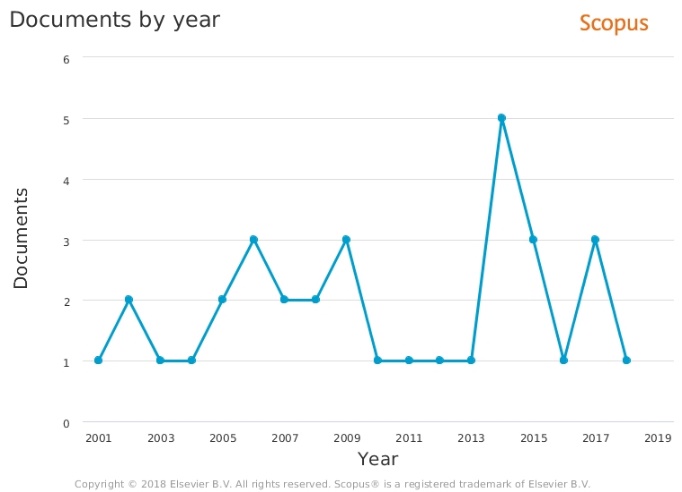 Tomando como criterios los países con investigaciones en el tema, el número de artículos científicos publicados y el desarrollo de innovaciones relacionadas con el tema, se identifica en la base de datos Scopus el creciente aumento en publicaciones indexadas relacionadas con la temática de estudio, registrándose un máximo de cinco (5) publicaciones en el año 2014, tres (3) en los años 2006, 2009, 2015 y 2017, y dos (2) en los años 2005, 2007 y 2008. La Figura 1 presenta la tendencia en publicaciones relacionadas con calidad ambiental sanitaria y parásitos en arena de playas en un lapso de 18 años, desde el 2000 hasta el 2018.