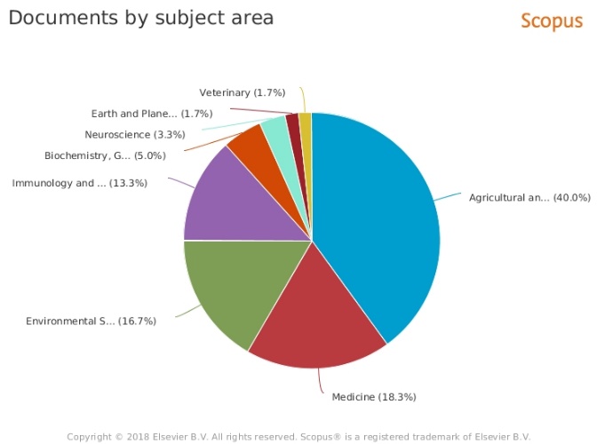Las subáreas en las que se desarrollan con mayor frecuencia investigaciones relacionadas con calidad sanitaria ambiental en playas son: agricultura y ciencias biológicas, ingeniería ambiental, medicina e inmunología, enmarcadas principalmente en áreas del conocimiento de agricultura y ciencias biológicas e Ingeniería. La Figura 2 presenta la sub áreas en las que se desarrollan con mayor frecuencia este tipo de investigaciones. La sub área de agricultura y biología incluyen interacciones de parásitos con otros organismos en las playas, estudios microbiológicos y sanitarios de la arena, entre otras investigaciones.