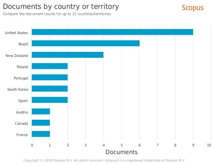 Los países con mayor número de publicaciones relacionadas con el tema son: Estados Unidos y Nueva Zelanda. Importante resaltar que en Latino América estas investigaciones se han desarrollado especialmente en Brasil (6 publicaciones), como se presenta en la Figura 3. Lo anterior permite inferir que el estudio de parásitos en playas empieza a ser un tema importante para enfrentar los problemas de salud pública, particularmente en regiones tropicales y subtropicales de países en desarrollo.