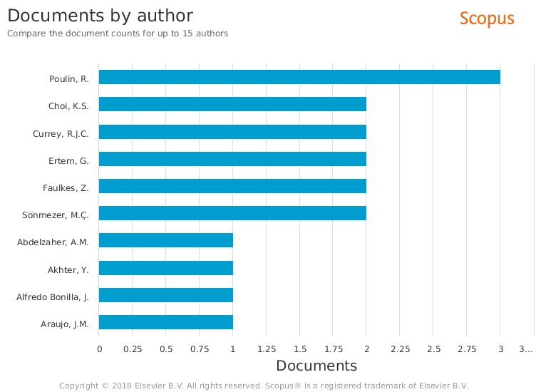 Entre los autores con mayor número de publicaciones se destacan Poulin R. con (3) tres publicaciones, Ertem G., Choi K.S, Currey R.JC., Faulkes Z., con (2) dos publicaciones y Abdelzaher Z., Araujo J.M., entre otros. con (1) una publicación (Figura 4). Lo anterior indica que hay pocas publicaciones relacionadas con el tema de parásitos en arenas como indicador de calidad ambiental de playas, lo que constituye un nicho con mucha información para realizar trabajos de investigación.